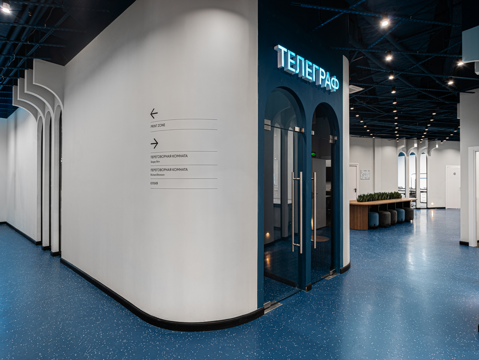 Минимализм и функциональность в оформлении open space и переговорных комнат гармонично сочетается с выразительными трафик-зонами и локациями для неформального общения.