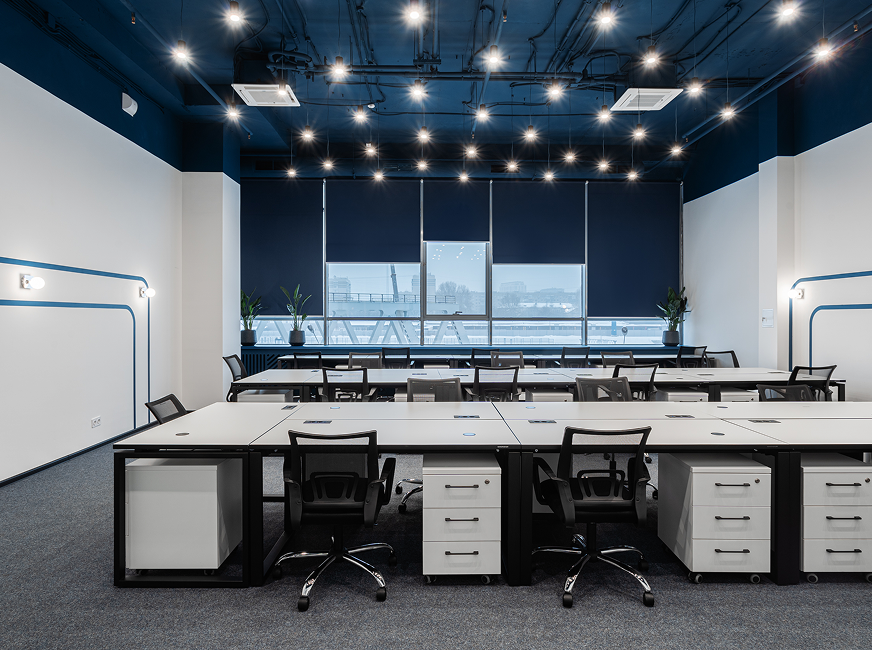 Сотрудникам доступны рабочие места (hot-desks), звукоизолированные кабины для индивидуальной работы и места для встреч и презентаций.
