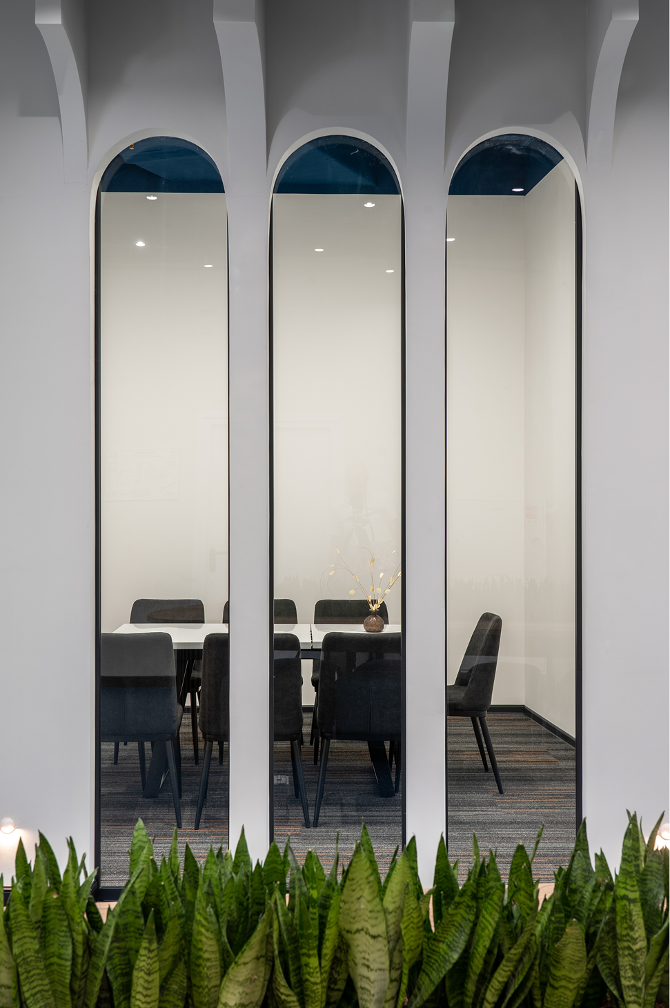 Главным композиционным элементом стала узкая арка вытянутой формы (отсылка к La Fabrica Рикардо Бофилла). Такое архитектурное решение актуально и с эстетической, и с практической точки зрения: арки не только создают ритмичный рисунок и формируют единство концепции, но и эффективно зонируют пространство, сохраняя свет и воздушность.