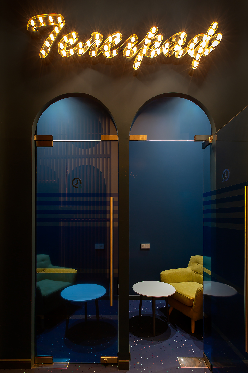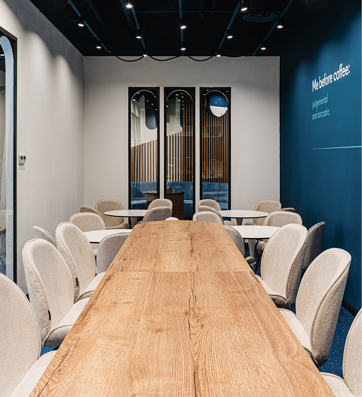 Высотность потолков, коридорная система с доступом к естественному освещению и многофункциональные трансформируемые пространства позволили реализовать различные сценарии использования: от продуктивной работы до проведения встреч, обучений и корпоративных праздников.