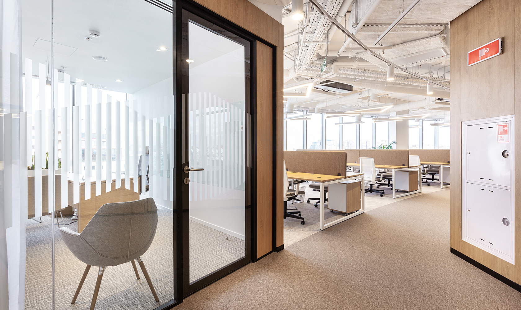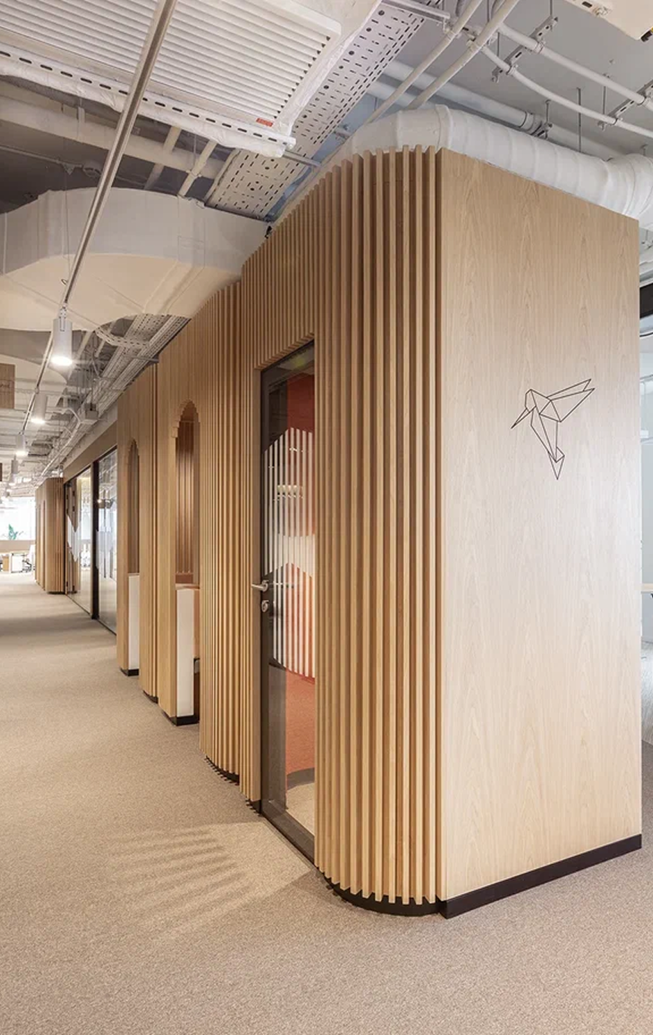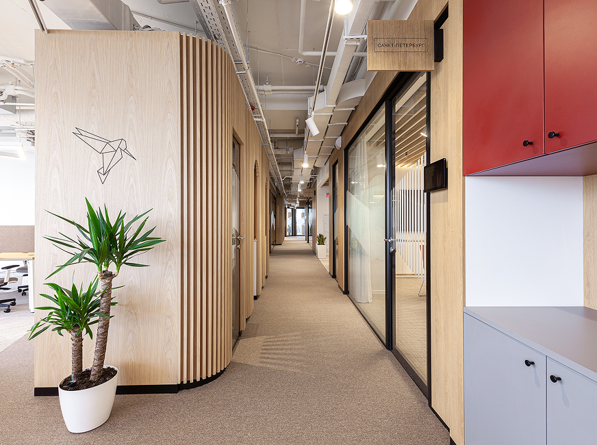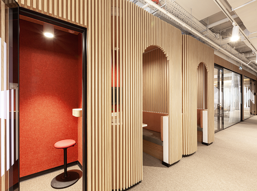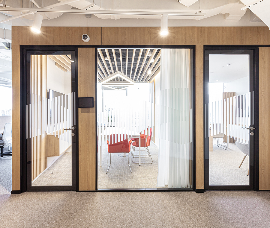 Несмотря на преимущественно открытую планировку, для поддержания комфорта сотрудников и эффективных переговоров предусмотрены различные закрытые рабочие зоны.