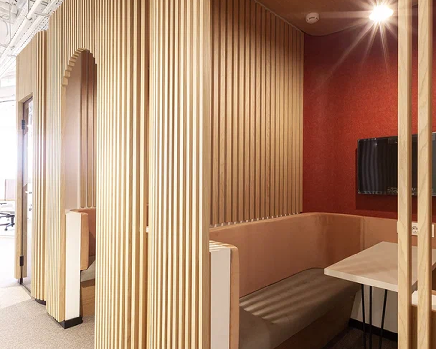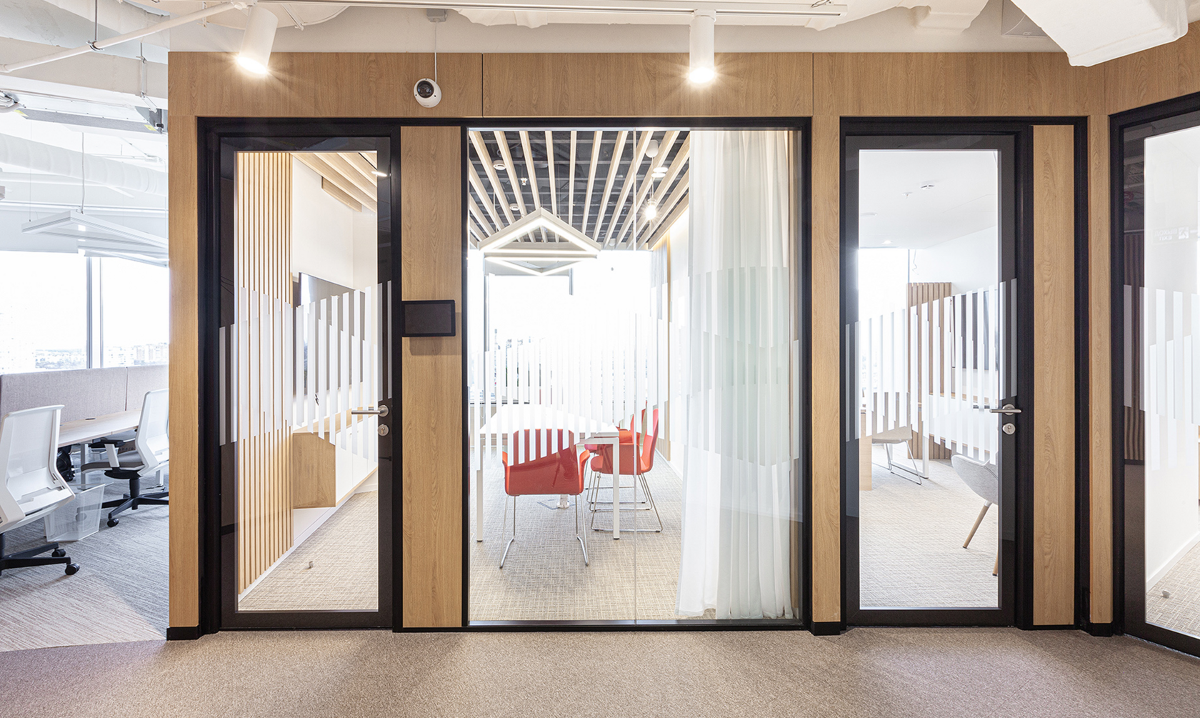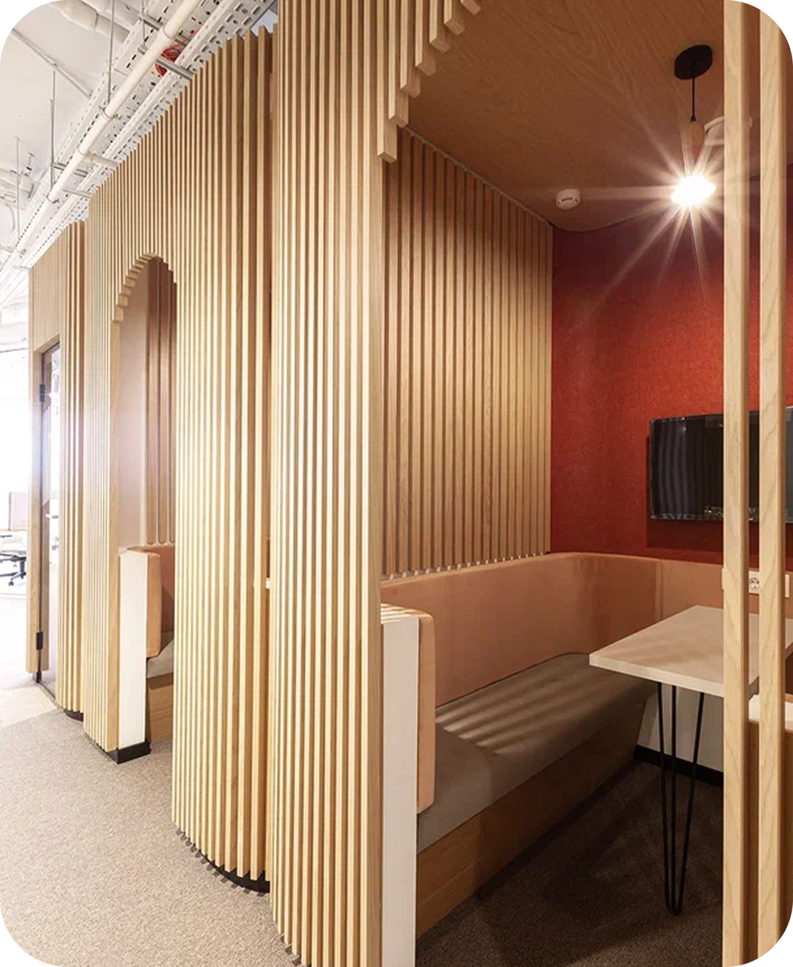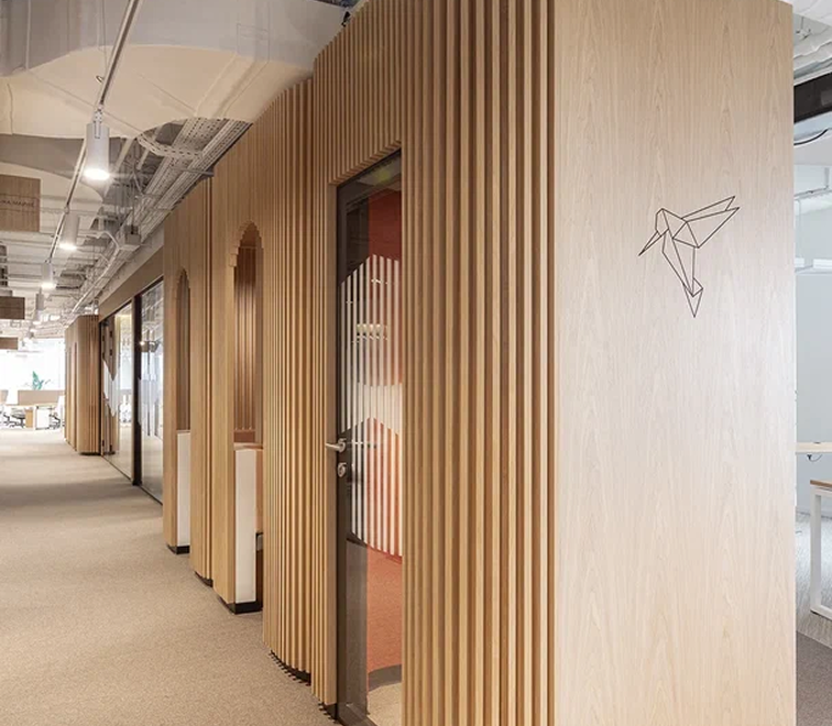 Несмотря на преимущественно открытую планировку, для поддержания комфорта сотрудников и эффективных переговоров предусмотрены различные закрытые рабочие зоны.
