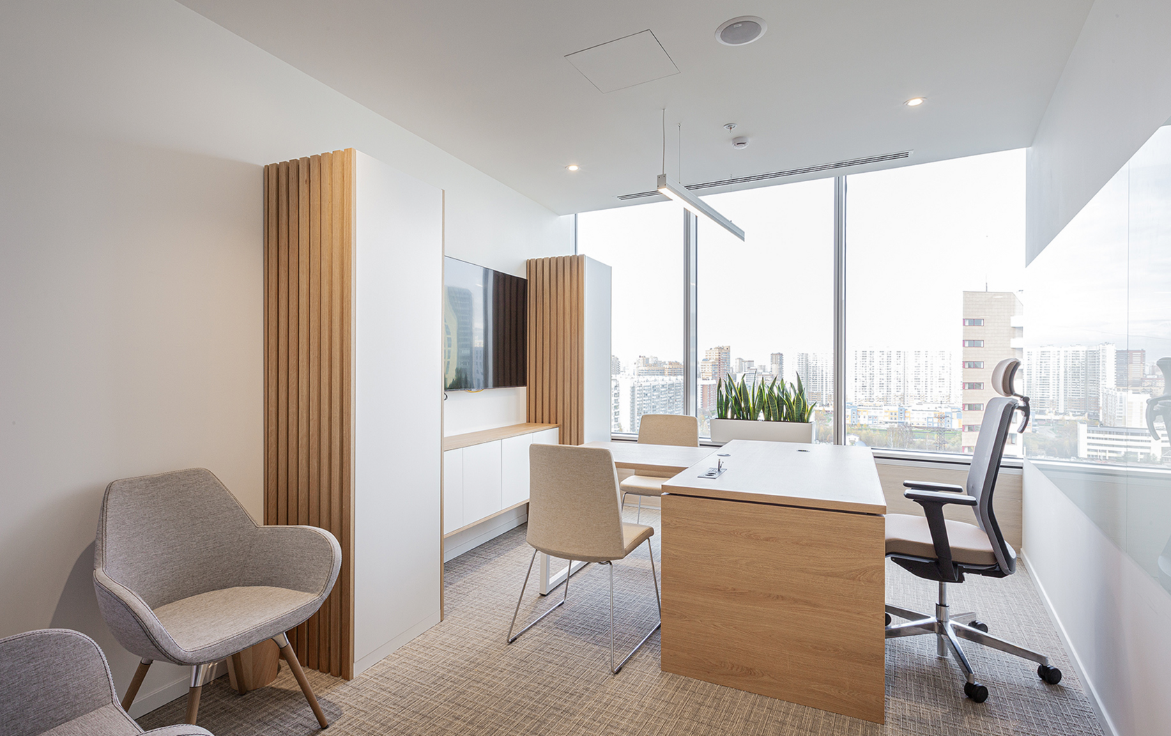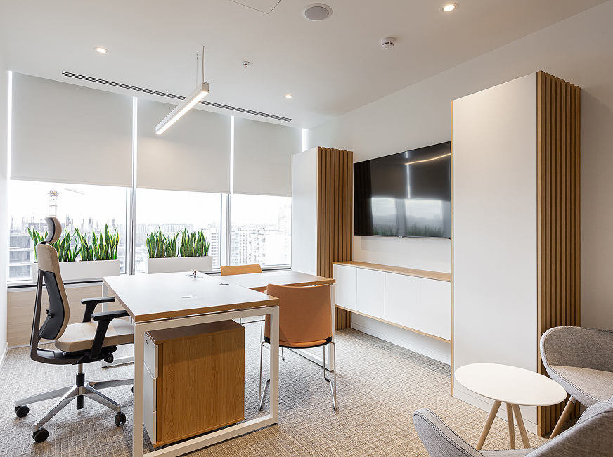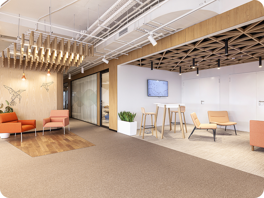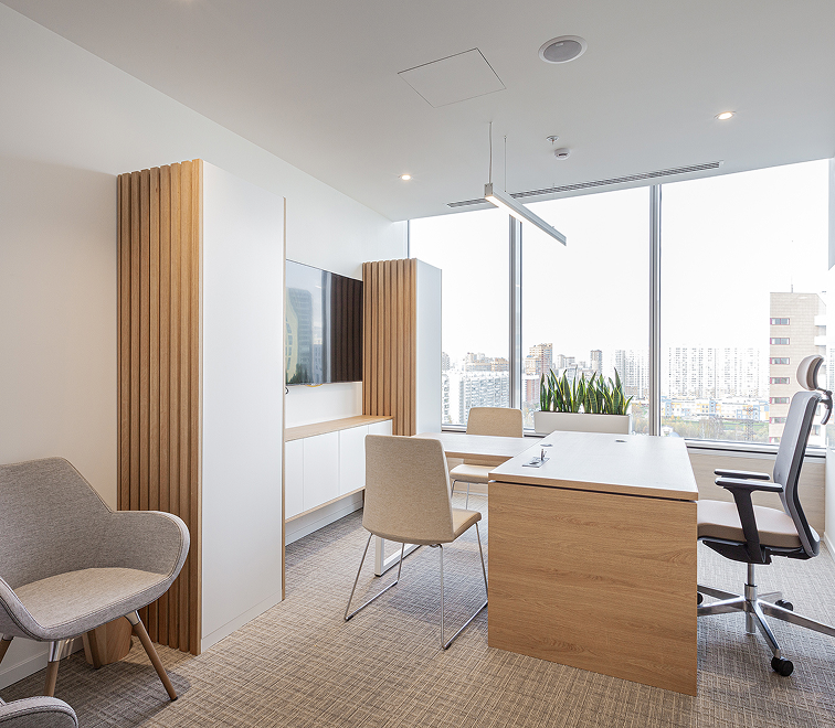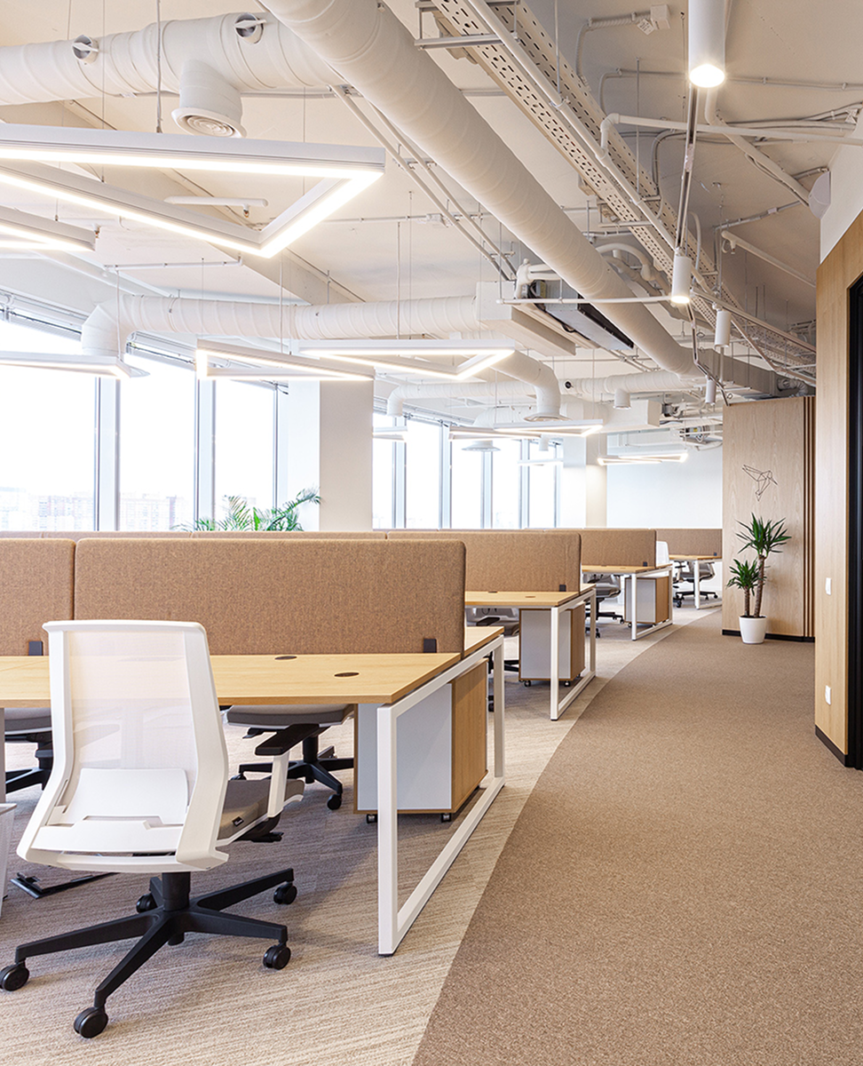 Штаб-квартира получилась современной, спокойной и располагающей, а грамотное проектирование и наше proptech-решение Q:OS позволили значительно сократить площади, не пренебрегая комфортом. Теперь сотрудники компании могут пользоваться технологичным пространством, а руководство — не думать о сервисе и не переплачивать за пустующие площади. В этом и преимущество формата fit-out: всё от визуализации офиса до сервисного обслуживания реализуется под ключ в рамках одного окна, а любая задача рассматривается генподрядчиком комплексно.