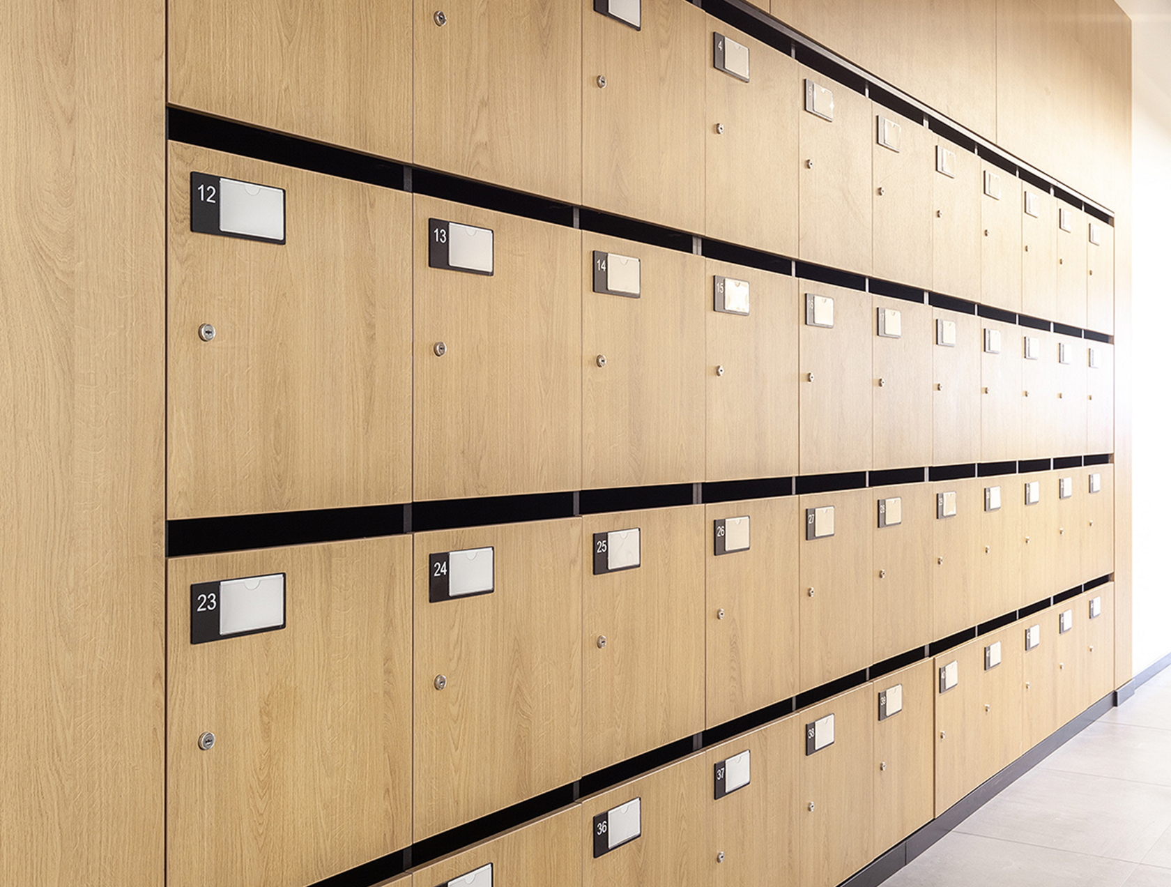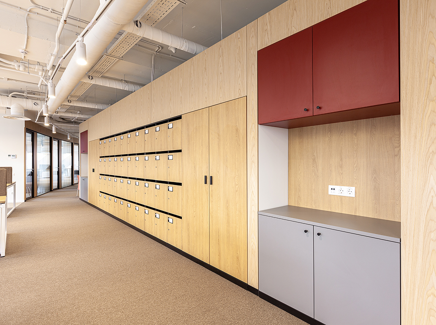 На смену закрепленным рабочим столам пришли совместные (shared desks). Их бронирование осуществляется в системе Q:OS, разработанной MANUFAQTURY. Благодаря внедрению этого решения теперь одним рабочим местом могут пользоваться поочередно 2–3 сотрудника. Также через мобильное приложение Q:OS организовано совместное пользование переговорными комнатами и локерами.