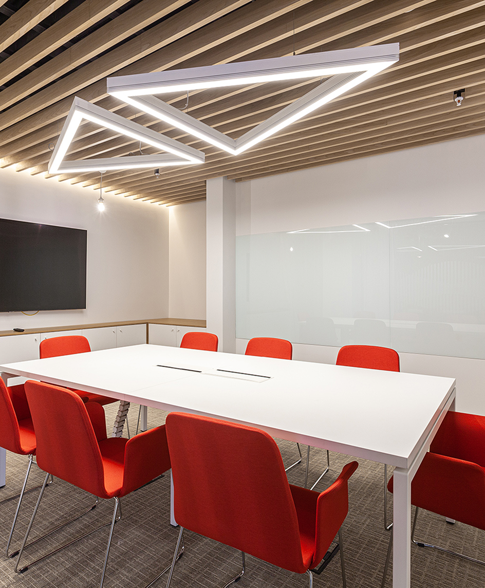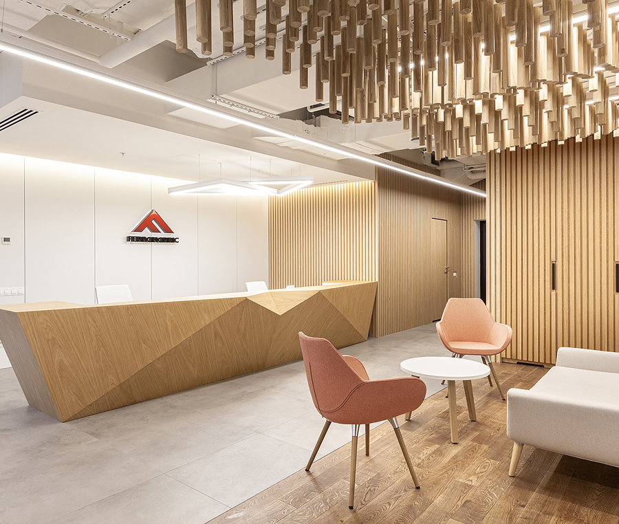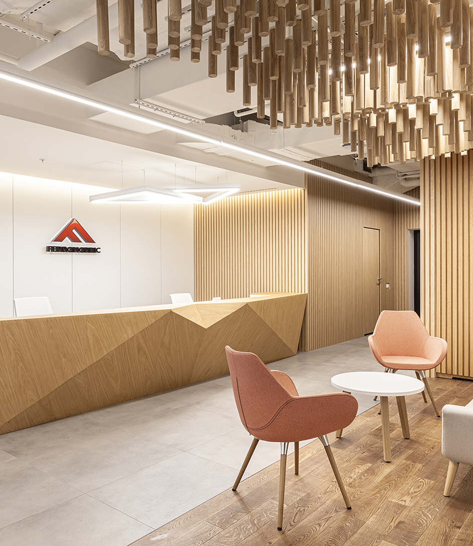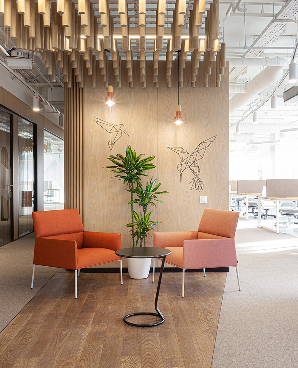 В дизайне используется большое количество треугольных элементов, которые повторяют логотип компании: форма стойки ресепшн, геометрические светильники и подвесной модульный потолок, а также рисунки птиц в декоре стен.