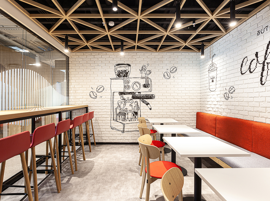 В оформлении — нейтральные основные цвета и мягкие акценты в фирменных оттенках красного, а также природные материалы: дерево различных текстур, натуральные ткани, декоративные растения.