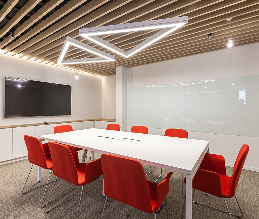 Переговорные комнаты в новом офисе оборудованы системами видеоконференцсвязи, плазменными панелями и планшетами для бронирования в Q:OS. Продуманное размещение розеток и хабов делает использование техники максимально удобным, без лишних проводов.